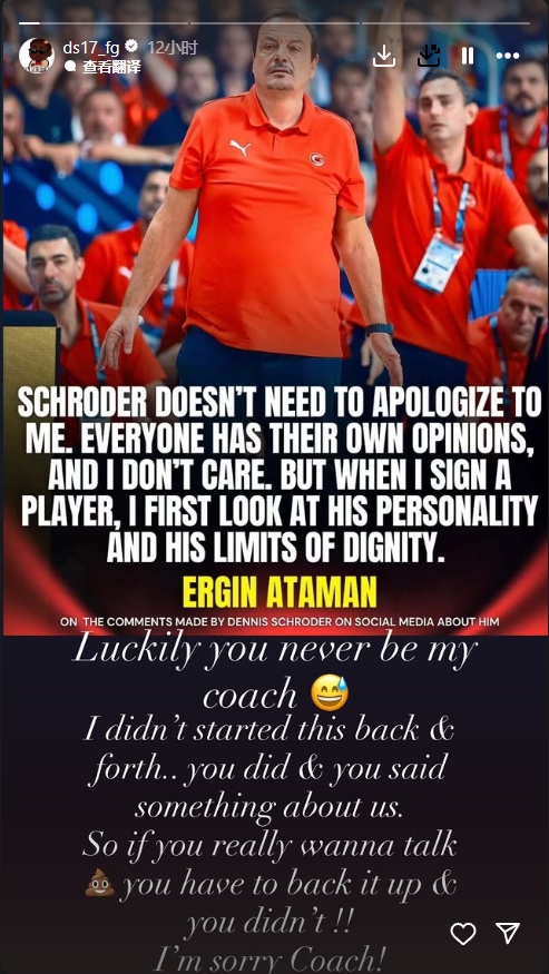 值得一提的是,丹尼-施罗德与阿塔曼就赛事最佳教练发生了口角。施罗德今日在个人社交媒体上再次回应了阿塔曼的言论:“幸好你从未成为我的教练。根本不是我挑起的纷争,是你挑起的。是你先发表了那些关于我们的言论,所以如果你真想谈那些事情,你得拿出证据来证明你的观点,而你并没有!!我很抱歉,教练!”