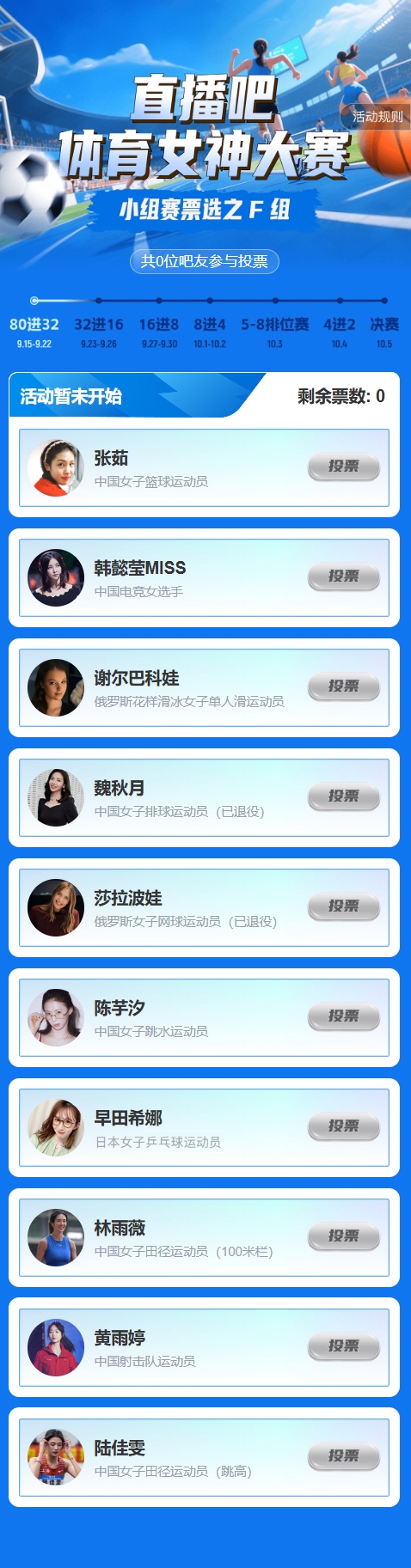9月20日17:00,小组赛F组的投票将正式开启,该组的参赛选手分别是: