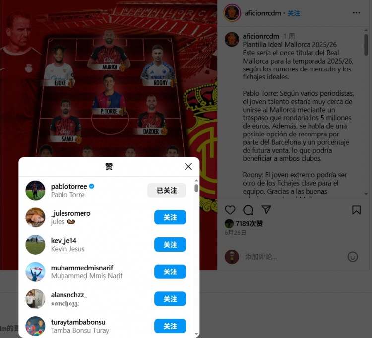 7月9日讯 《每日体育报》报道,巴萨中场巴勃罗-托雷点赞了自己加盟马洛卡的相关动态。