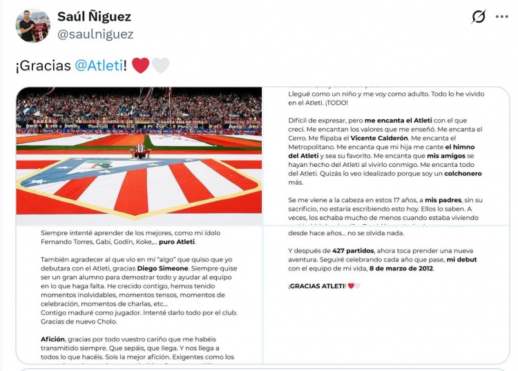 7月24日讯 在确认自己将加盟弗拉门戈后,萨乌尔更新社媒告别马竞。