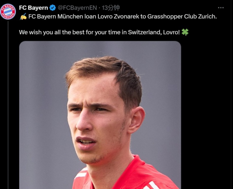 7月29日讯 拜仁官方宣布,外租20岁中场兹沃纳雷至苏黎世草蜢俱乐部。