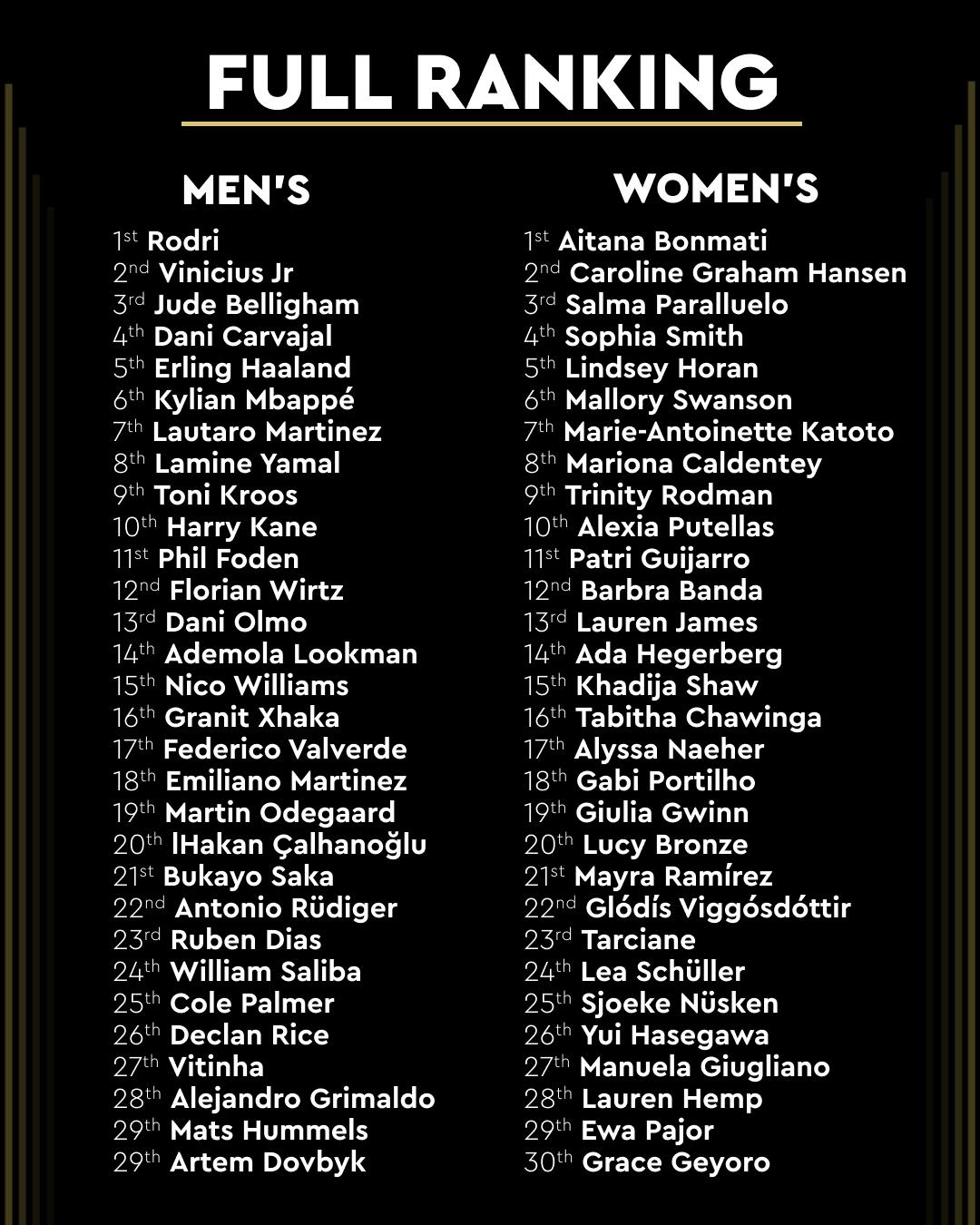 08月07日讯 今天,金球奖官方公布了2025年金球奖的30人大名单。回顾去年的金球奖排名,罗德里最终成为90后首获金球奖的球员。