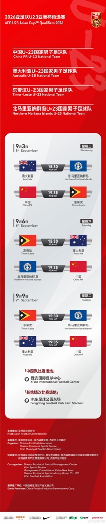 8月6日下午,中国足协通过官方社交平台公布了2026年U23亚洲杯预选赛D组,也就是中国U23队(现U22国足)所在小组赛事的赛程及各轮对阵安排、开球时间。赛程显示,中国U23队将分别于9月3日、6日、9日晚与东帝汶、北马里亚纳群岛、澳大利亚的同龄球队过招,3场比赛均安排在西安国际足球中心球场进行。