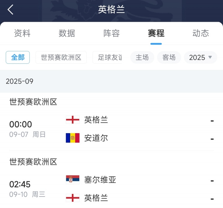 9月份两场世预赛,英格兰将在主场对阵安道尔,客场对阵塞尔维亚。目前英格兰在世预赛中3战全胜积9分,排名K组第1。
